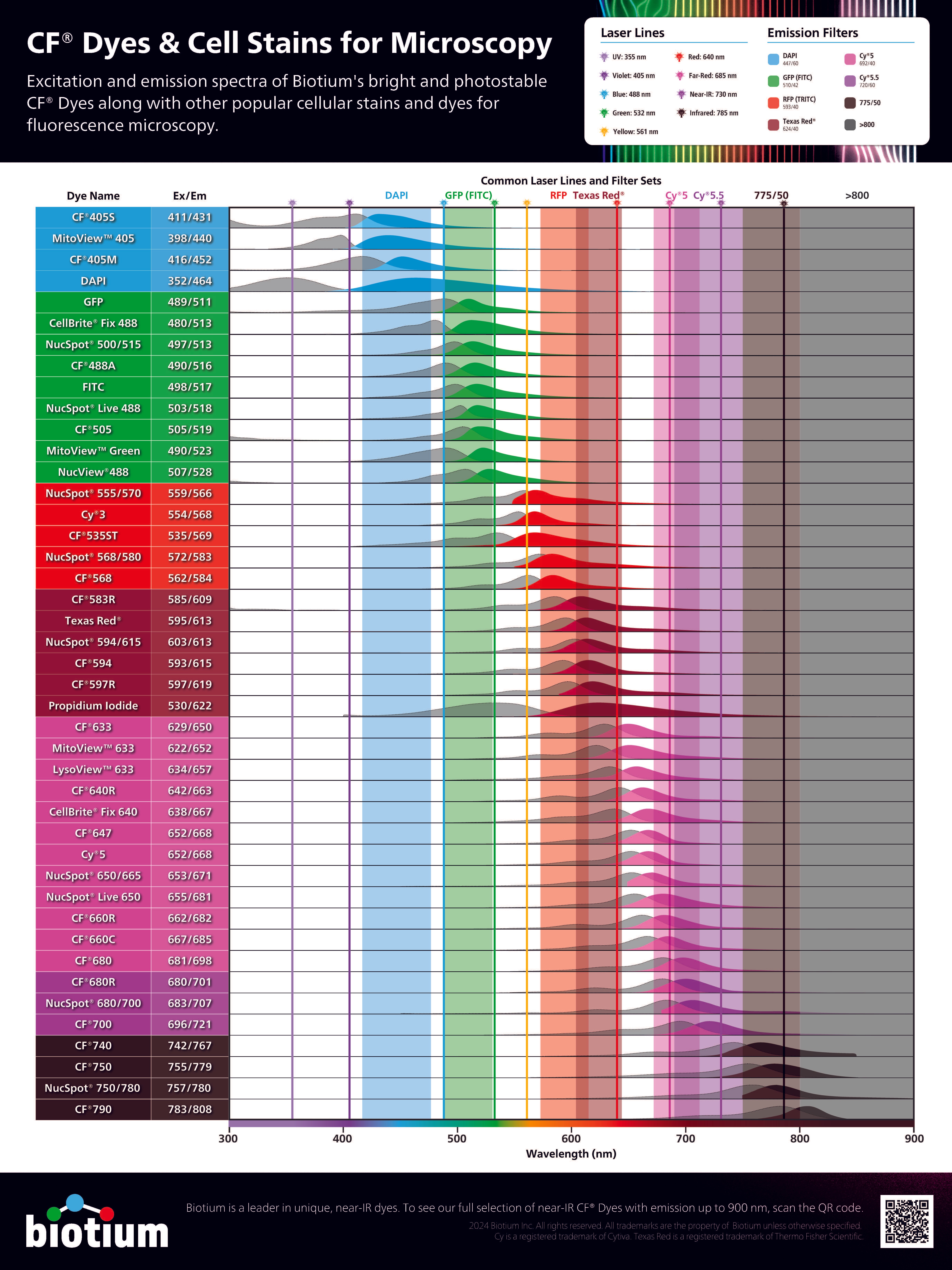 Scientific reference posters designed to help researchers select the right fluorescent dyes for microscopy and flow cytometry. Each chart maps excitation and emission spectra across common laser lines and filter sets, translating dense technical data into a clear, scannable visual format.